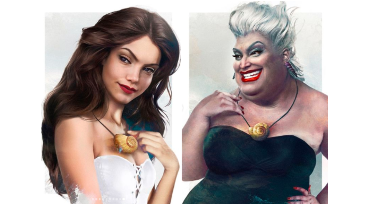 ¡2X1! El artista grafico de Instagram que nos regaló estas imágenes nos dio a Úrsula de La Sirenita en sus dos versiones de villana, y no podemos negar que en cada una de ellas irradia maldad pura.