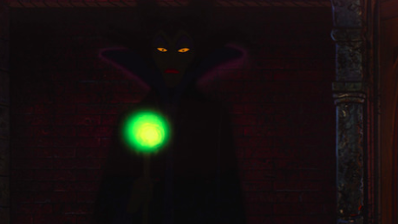 Su solo nombre describe la maldad de este personaje y una de las tantas escenas de la película de La Bella Durmiente es cuando aparecen sus tenebrosos ojos de Maléfica en la chimenea.