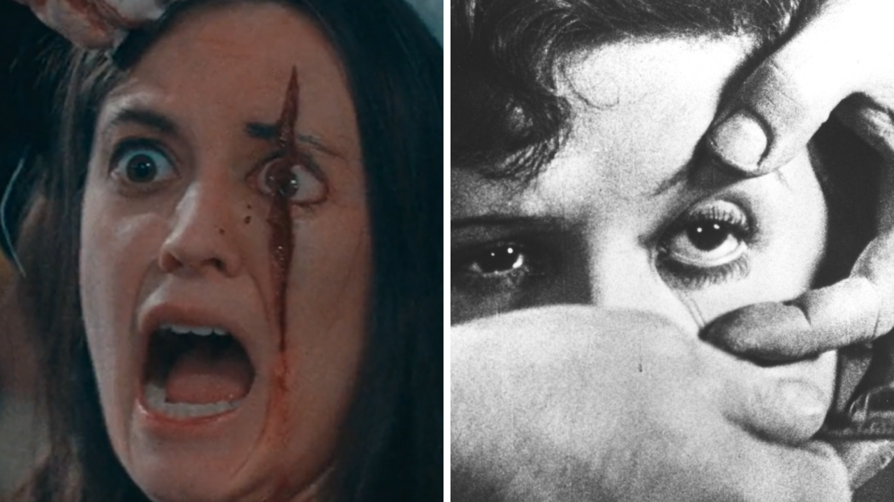 La controvertida y apabullante escena del dormitorio comienza con una agresión que le rinde homenaje a una de las películas más estudiadas en la historia del cine: Un perro andaluz, dirigida por Luis Buñuel y Salvador Dalí. En la secuencia inicial del filme surrealista, el propio Buñuel toma una navaja para afeitar y mutilar horizontalmente el ojo de una mujer, mientras que en esta escena de Terrifier 2, Art the Clown corta el ojo de su víctima de forma vertical.