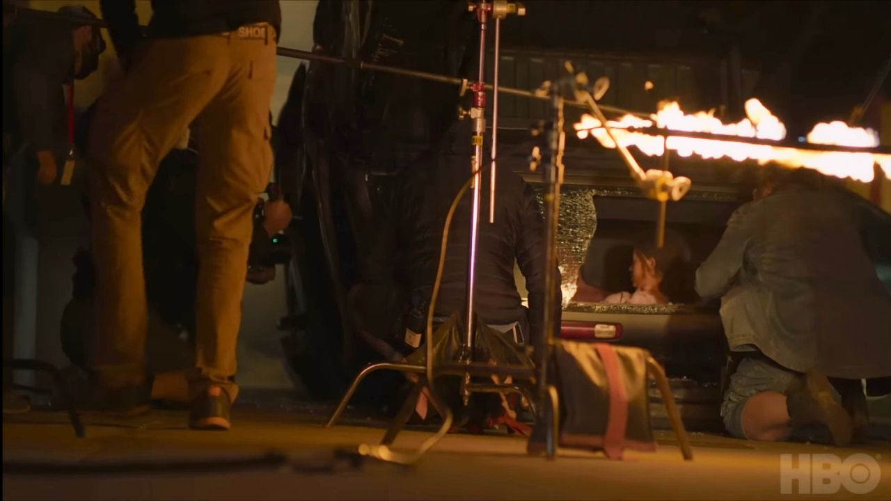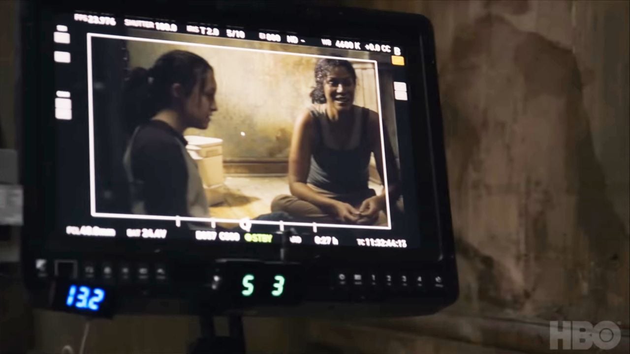 Uno de los factores más importantes de The Last of Us es que se desarrolla dentro de un ambiente postapocalíptico. En esta imagen vemos el uso de pantallas azules para filmar algunas de las escenas de acción donde la catástrofe por el Cordyceps comienza a desarrollarse.
