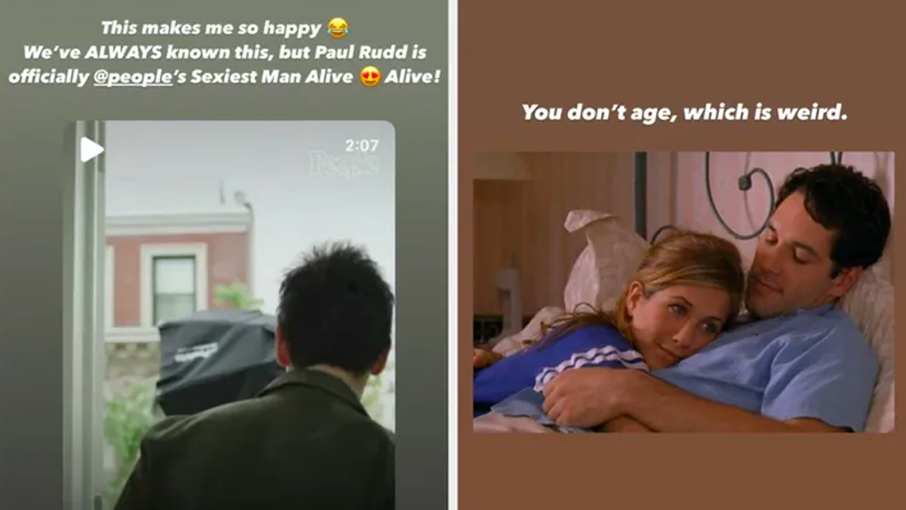 Cuando Paul Rudd recibió el título del hombre más sexy del mundo en 2021, el cual hace poco fue entregado a Chris Evans por People, Aniston no dudó en felicitar al actor, compartiendo tiernos mensajes en sus redes sociales. En una historia de Instagram escribió "Esto me hace muy feliz. SIEMPRE lo hemos sabido, pero Paul Rudd es oficialmente el hombre vivo más sexy de People". Asimismo añadió "No envejeces, lo cual es raro. Pero aún te amamos"