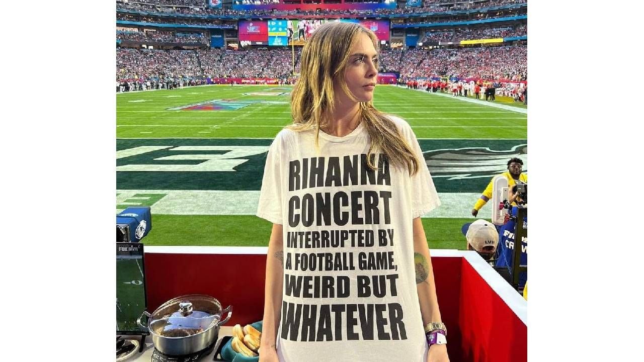 Cara Delevigne fue para darle apoyo a su amiguísima Rihanna y portó una playera que contiene la leyenda "El concierto de Rihanna fue interrumpido por un juego de fútbol, qué extraño pero bueno".
