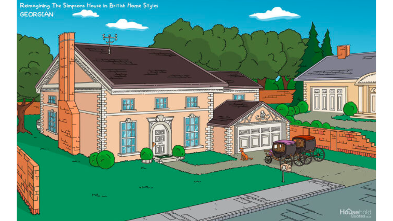 Gran Bretaña acostumbraba a llamar a sus reyes George, y al descubrir edificios de la Antigua Grecia, muchos diseñadores se inspiraron para crear casas a los reyes. Para esta construcción de Los Simpson de añadió la distinción de los llamados 'quoins', una piedra decorativa que va a lo largo de los bordes de las esquinas de las edificaciones.