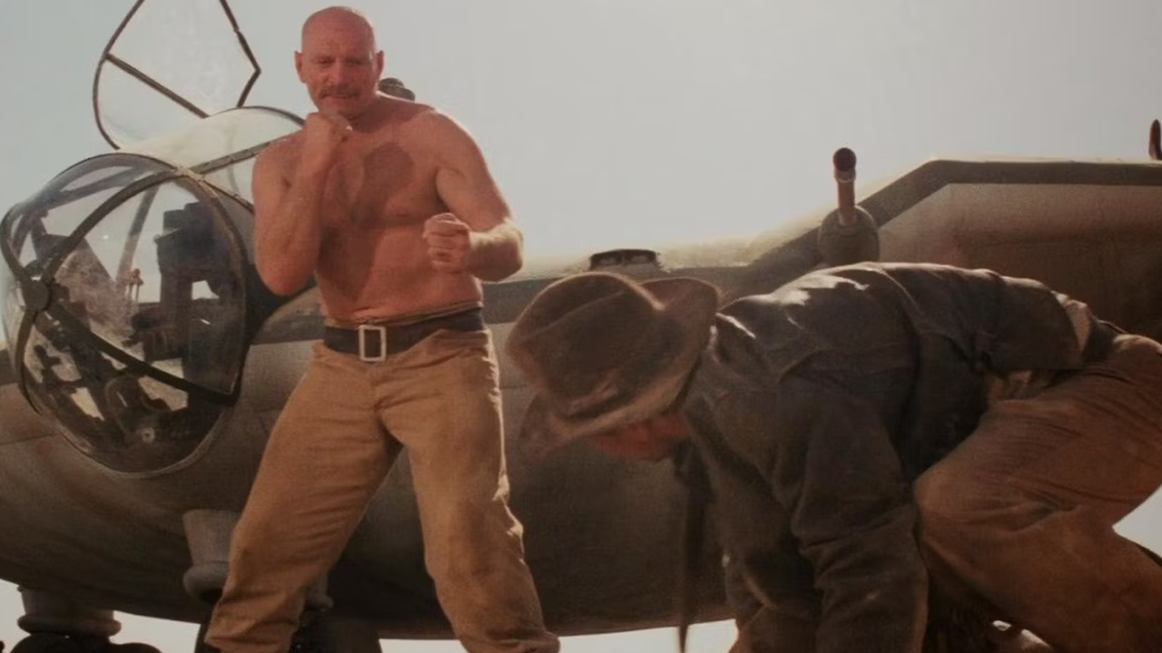 Justo cuando Indiana quiere robar un avión para ejecutar su escapada, un enemigo alemán lo reta a una pelea que termina con él incustrándo su cara en la hélice del avión. ¡auch!