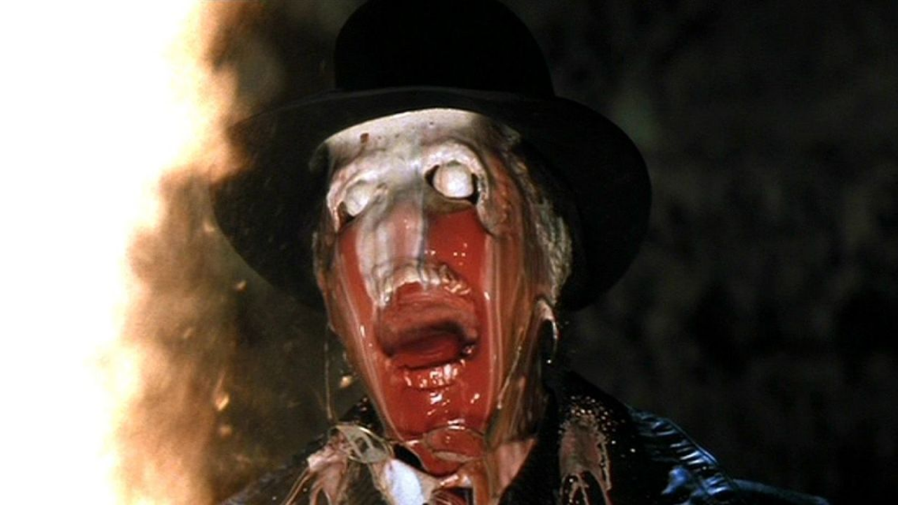 En el caso del agente de la Gestapo, Major Toht, su rostro literalmente se desprende, ya que los espíritus que emergen del cofre del Arca evocan llamas que derriten su rostro y lo separan de su cráneo.