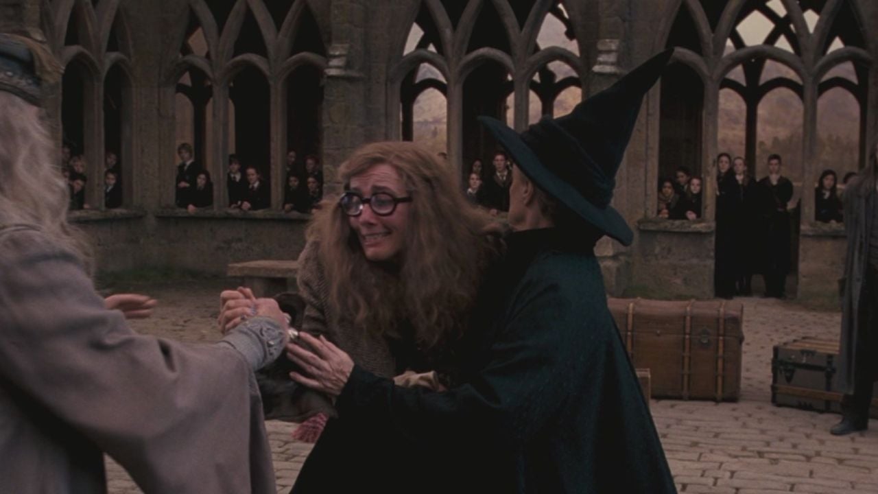 Cuando Dolores Umbrigde quiere sacar a la profesora Trelawney de Hogwarts en Harry Potter y la Orden del Fénix, las cosas suceden de forma distinta a la última versión. Mientras sale, ella sigue comiendo y haciendo ruido con lo que lleva en la mano.