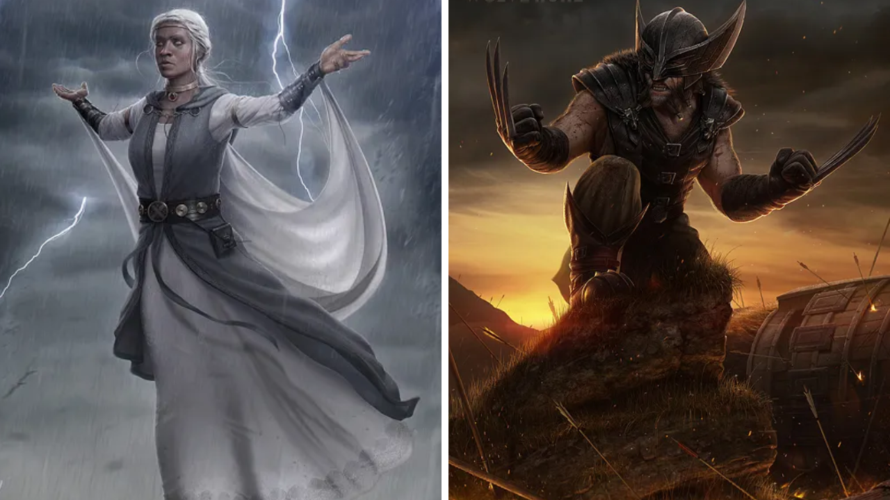 En el arte conceptual de Nate Hallinan, Storm (que ha sido interpretada en cine por Halle Berry y Alexandra Shipp) emerge como una poderosa sacerdotisa del clima, con vestimenta sutil y etérea y una mirada que podría conjurar tormentas. Wolverine (encarnado por Hugh Jackman), por otro lado, se convierte en un feroz guerrero nórdico, con garras que relucen en el acero y una mirada intensa que intimida incluso a los más valientes.