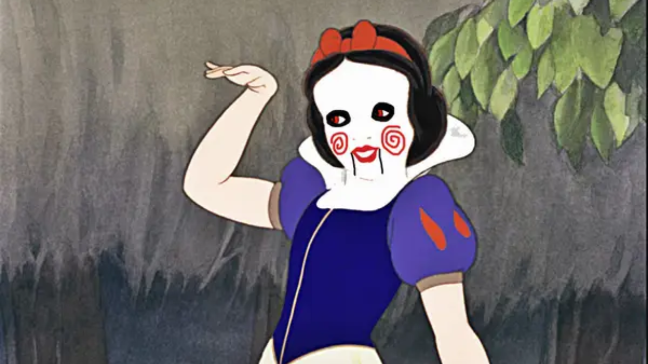 La princesa de Blancanieves y los siete enanos, conocida por su piel pálida como la nieve, se transformaría en una figura terrorífica. Su tez ahora estaría cubierta de maquillaje blanco y sus labios rojos se destacarían de manera intensa, con gesticulaciones tenebrosas en su rostro. La emblemática manzana envenenada ahora sería un elemento siniestro en su mano, utilizada para comunicar las macabras intenciones de su creador, John Kramer