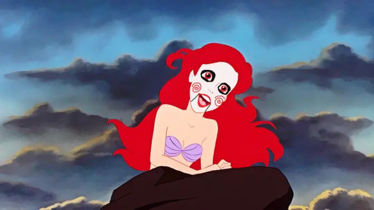 Ariel de La sirenita, conocida por su encanto acuático, se transformaría en una imagen aterradora. Su piel pálida y ojos saltones se destacarían en un maquillaje blanco, con líneas rojas acentuando la boca en una sonrisa inquietante. Su voz melodiosa ahora sería una herramienta para comunicar las crípticas instrucciones de John Kramer a sus víctimas.
