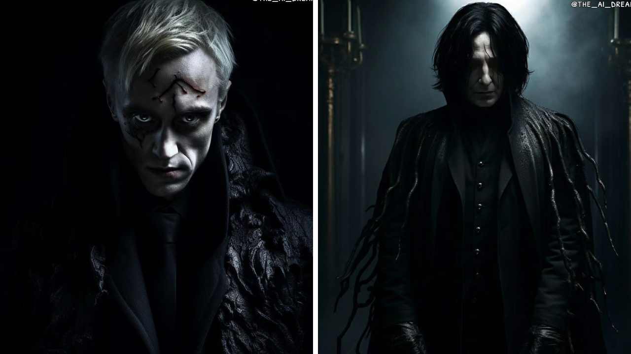 Draco Malfoy (Tom Felton), antes el estereotipo de un joven arrogante, se transforma en un ser con rasgos reptilianos, su piel pálida ahora está salpicada de escamas y sus ojos brillan con una malevolencia inquietante. Mientras tanto, Severus Snape (Alan Rickman), conocido por su dualidad en la franquicia cinematográfica, se presenta aquí en su faceta más oscura. Su mirada intensa está ahora envuelta en un halo de misterio aún más oscuro, y su figura se erige con una presencia imponente que irradia un aura tenebrosa.