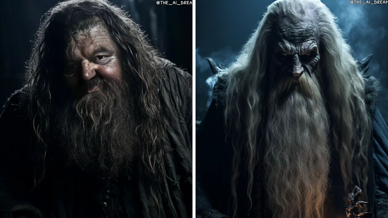 Hagrid (Robbie Coltrane) se transforma en una imponente y temible presencia demoníaca. Su figura colosal se vuelve aún más aterradora, adquiriendo una tonalidad siniestra. Sus ojos, antes cálidos y afables, ahora destellan con una malévola intensidad. Por otro lado, Albus Dumbledore (Michael Gambon) revela su lado oscuro en esta visión. Su sabiduría se mezcla con un aura demoníaca, y su mirada adquiere un brillo inquietante. Su presencia, una vez reconfortante, ahora emana una sensación de inquietante poder.