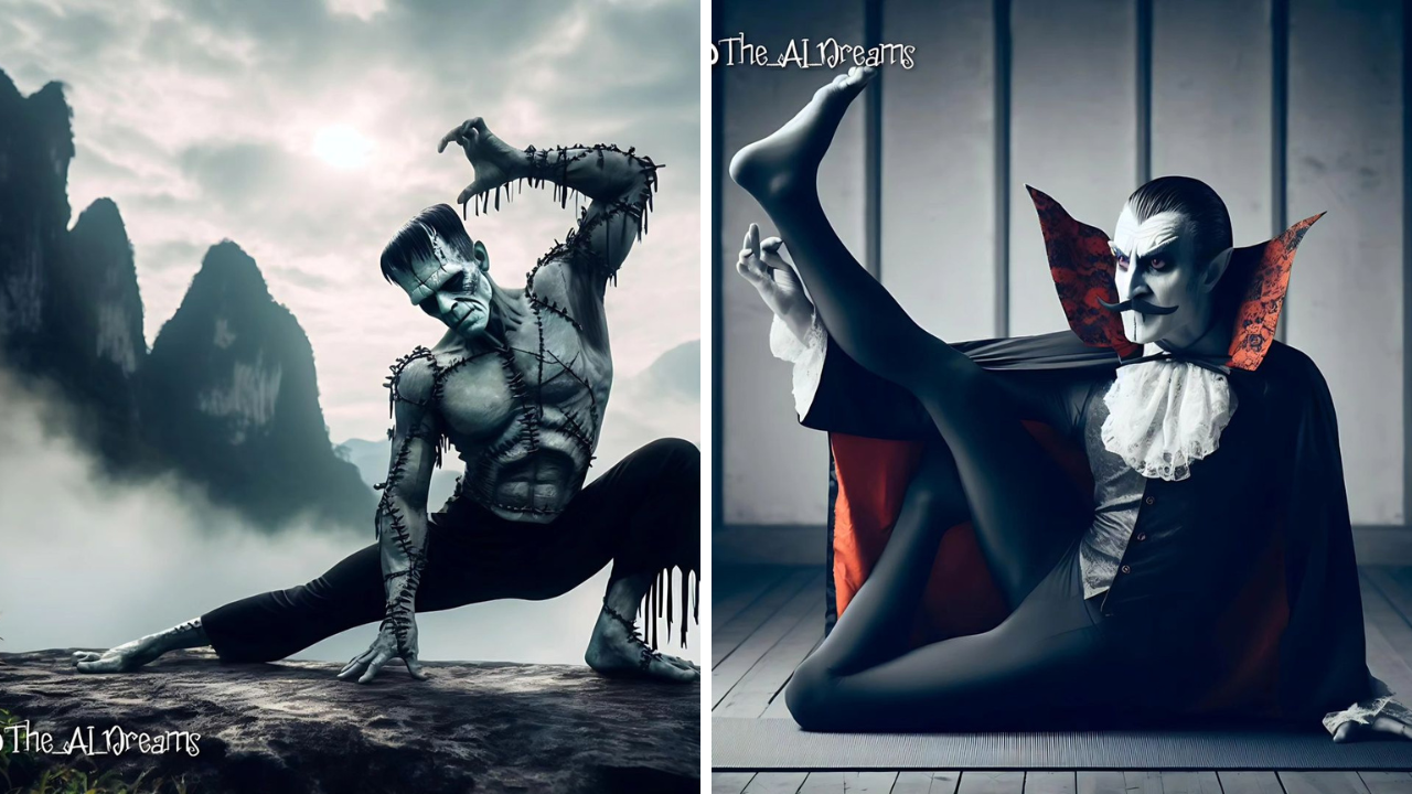 La icónica criatura de Frankenstein y Drácula, el infame vampiro, son dos iconos del cine de terror clásico. En estas imágenes vemos una faceta inusual de estos personajes. Frankenstein, conocido por su naturaleza monstruosa, se encuentra en una postura con la que demuestra una sorprendente gracia y fuerza. Drácula, el señor de los no muertos, adopta una postura que evidencia una elegancia inesperada.