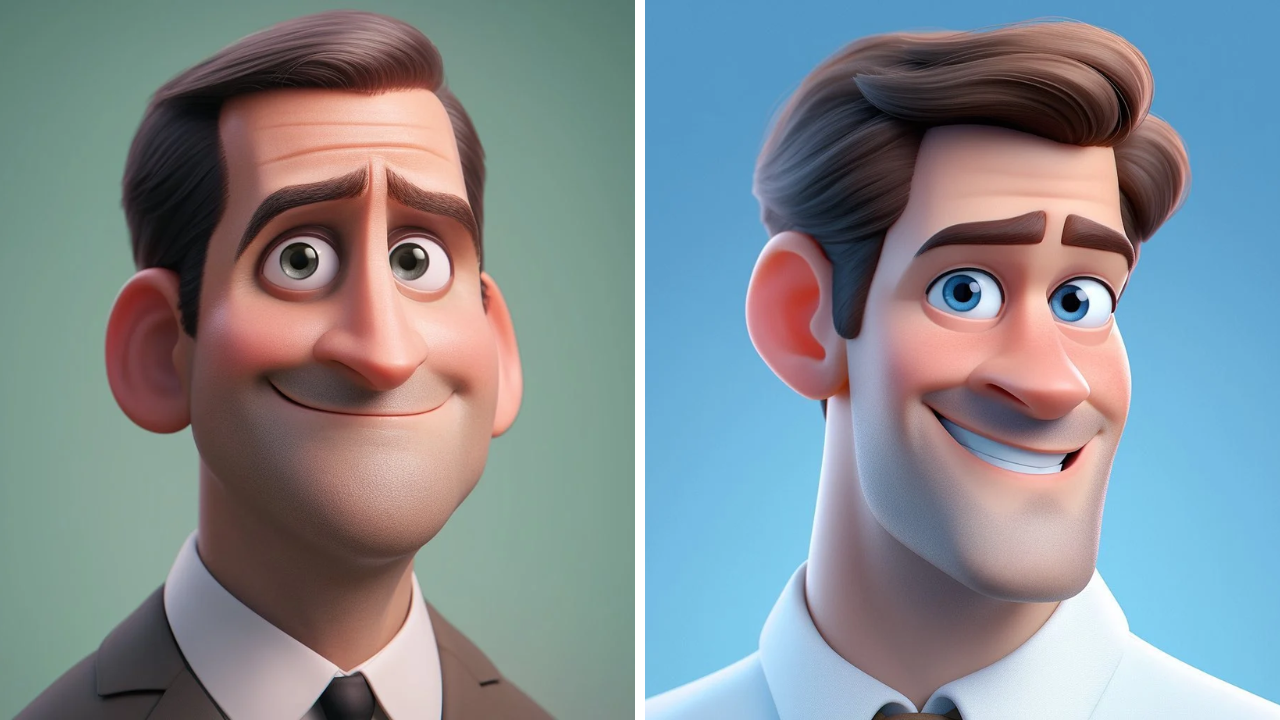 En esta imaginativa fusión, Michael Scott (interpretado por Steve Carell) y Jim Halpert (interpretado por John Krasinski) toman vida con un toque de magia animada. Inspirados en la estética de Pixar, estos personajes adoptan ojos grandes y expresivos, recordando a clásicos como Toy Story. La animación les otorga una nueva dimensión mientras mantienen la esencia cómica que los ha convertido en favoritos del público.