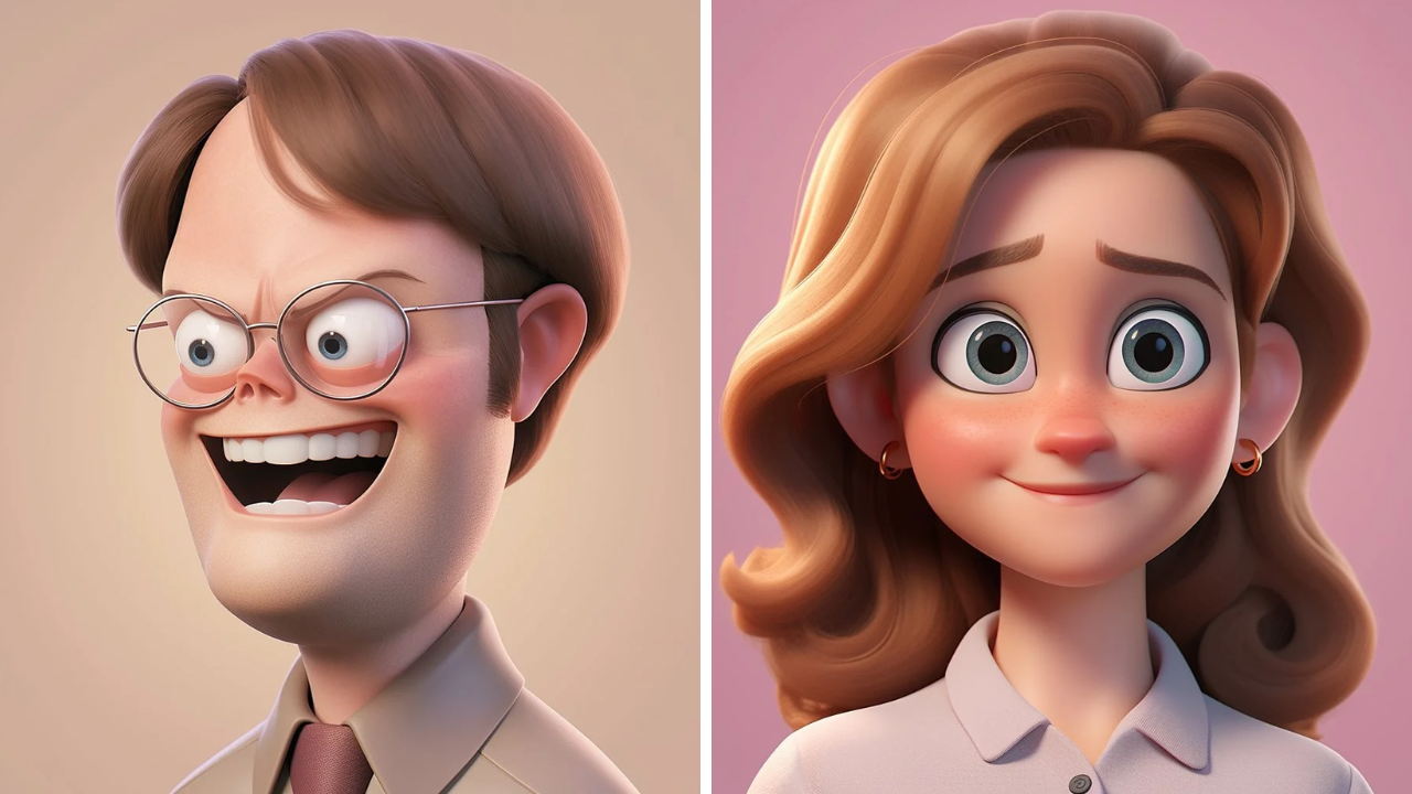 Dwight Schrute (interpretado por Rainn Wilson) y Pam Beesly (interpretada por Jenna Fischer) experimentan una transformación encantadora en este cruce. Con características redondeadas y expresiones llenas de personalidad, los personajes canalizan la vibrante animación de películas como Los Increíbles. La reinterpretación visual de Dwight y Pam agrega un nuevo nivel de carisma a estos miembros queridos de Dunder Mifflin.