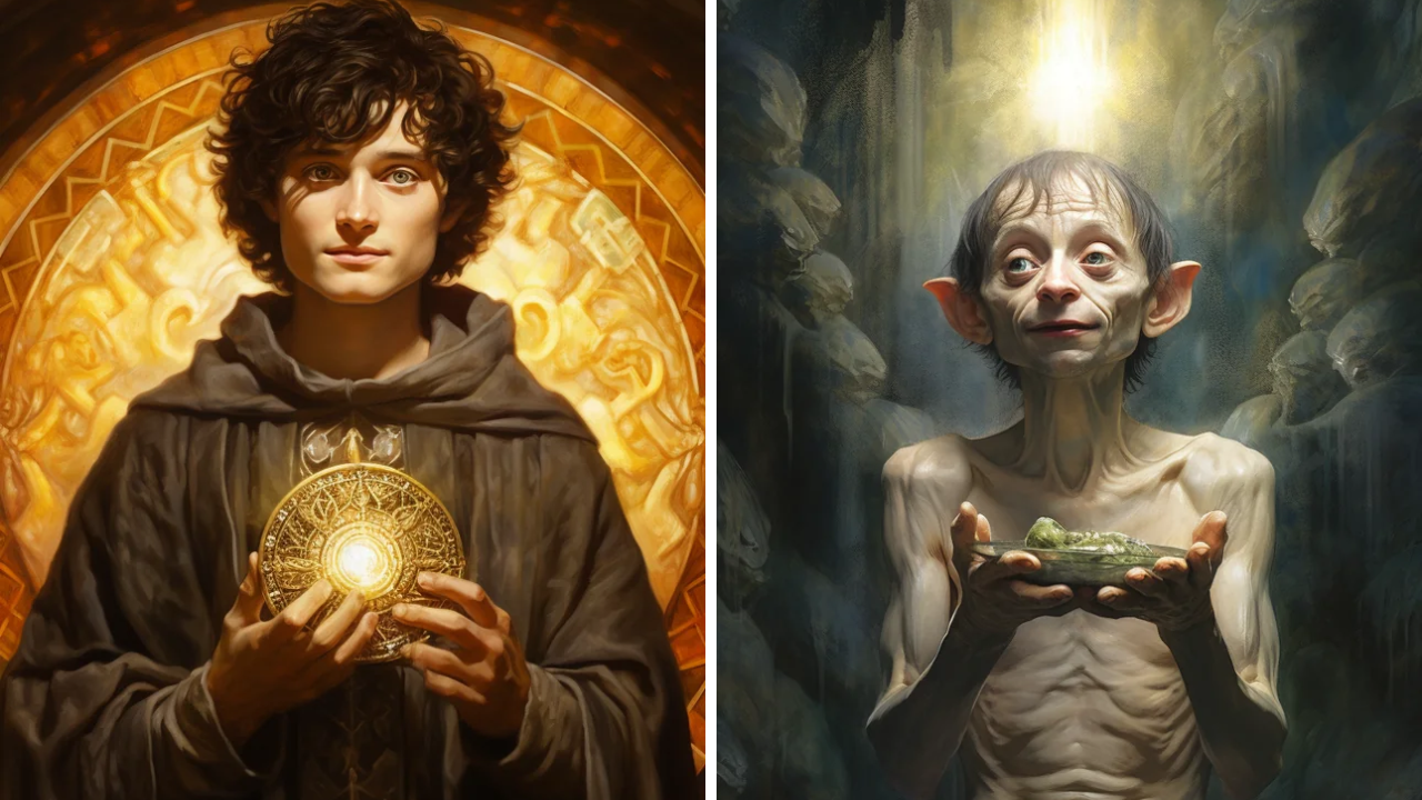 En esta reinterpretación visual de los personajes de El señor de los anillos como santos, Frodo (interpretado por Elijah Wood) y Gollum (interpretado por Andy Serkis) se convierten en figuras que personifican la virtud. Frodo, el portador del Anillo, se presenta como un santo sereno, bondadoso y triunfante, mientras que Gollum deja atrás su alma torturada para encarnar la redención y la esperanza.