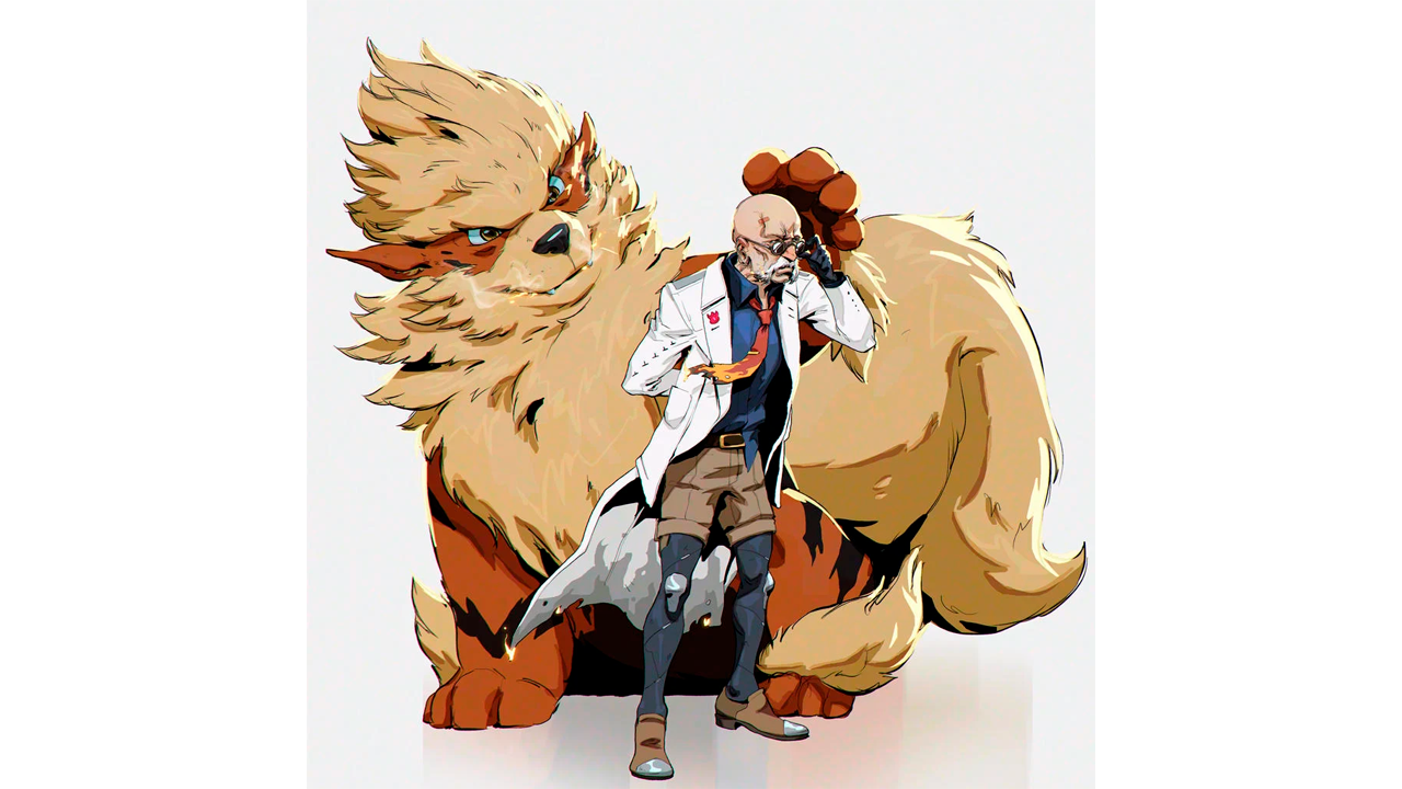 Blaine, el líder del gimnasio en Isla Canela, el maestro de los acertijos. Su especialidad son los Pokémon tipo fuego, un Arcanine posa detrás de él. Y como vemos, con unos años extra Blaine sigue luciendo su bigote blanco y el par de lentes oscuros que lo caracterizan.