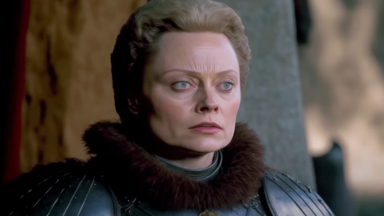 Una toma de preocupación en el rostro de una de las guerreras más hábiles en combate, portando por su puesto su armadura. En esta imagen Brienne de Tarth podría estar expresando su emoción al pensar en la protección de aquellos a quienes es leal.
