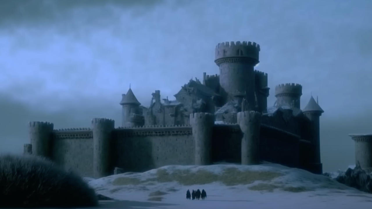 Winterfell, el sitio ancestral de la Casa Stark, al norte de Westeros. Podemos ver un plano amplio de la imponente fortaleza, capital de la región del Norte, cubierta por una atmósfera oscura y fría.