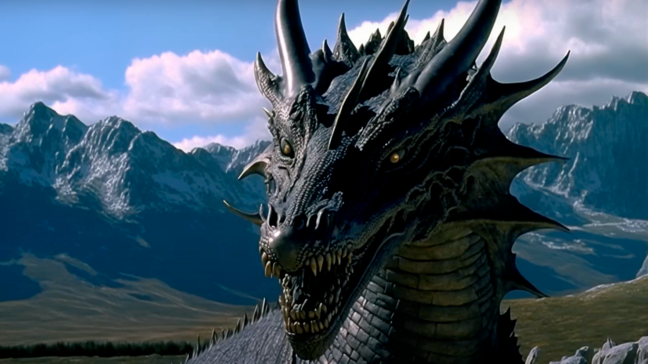 Con efectos muy característicos de los años 80, este sería el rostro de Drogon, la criatura más más grande y feroz de la hija póstuma del rey Aerys II Targaryen.
