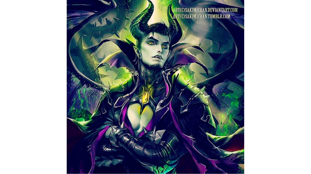 La versión masculina de la hechicera que puso a dormir a Aurora tendría esta apariencia. El dibujo de esta artista que reimagina a Maléfica se mantiene fiel a esta apariencia semi-demoniáca que nos presentó Disney hace años y que reafirmó cuando Angelina Jolie le dio vida.