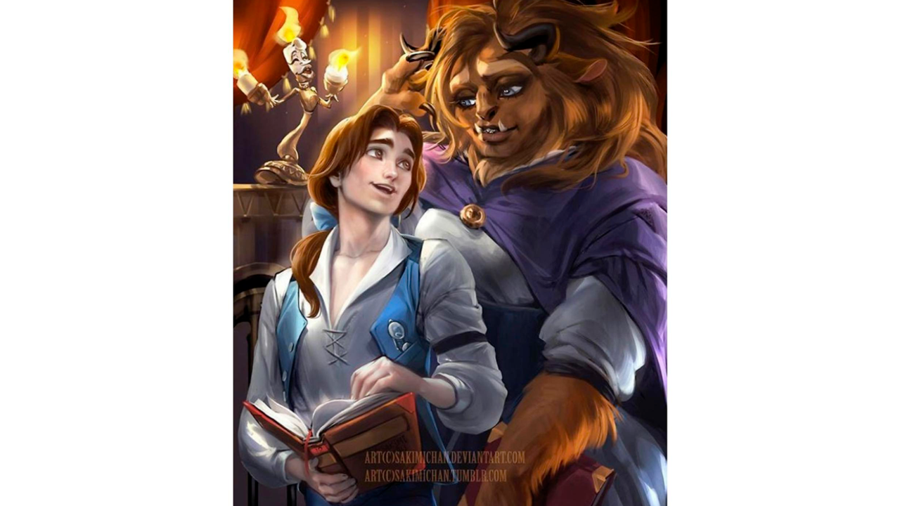 Las versión reinventada de La Bella y la Bestia es una de las más curiosas. Bella sería el joven que disfruta arduamente de la lectura y la Bestia, en su versión femenina, aprendería a abrir su corazón ante la bondad del joven aldeano. También aquí Lumiere luce distinto, distinta.