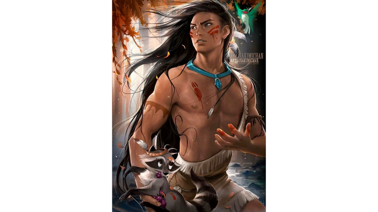 Una de las figuras más representativas de los pueblos indígenas de Estados Unidos es Pocahontas. Si la versión de Disney hubiese retomado su historia con un hombre de protagonista, este sería el resultado según el artista. Checa que incluso Meeko y Flit cambiaron de apariencia.