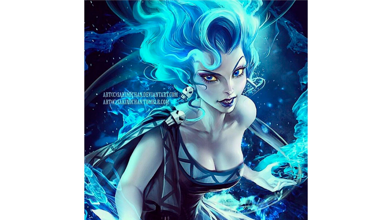 Comenzamos con un villano épico de la historia de Hércules. Sería impresionante ver esta versión de Hades, tendríamos una diosa custodiando a las almas del Inframundo. Su representación femenina mantiene el cabello/flama azul, su mirada intensa y dientes afilados.