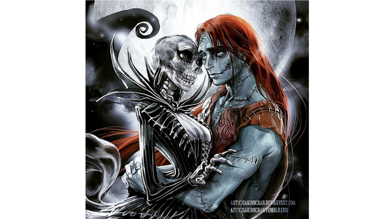 Salidos de El extraño mundo de Jack tenemos una versión completamente distinta de Sally y Jack. Por un momento la mente nos juega una broma pensando que a la izquierda tenemos a Sally, ¡pero no! Es Jack a la izquierda en su versión femenina y Sally abrazándole con su versión masculina.