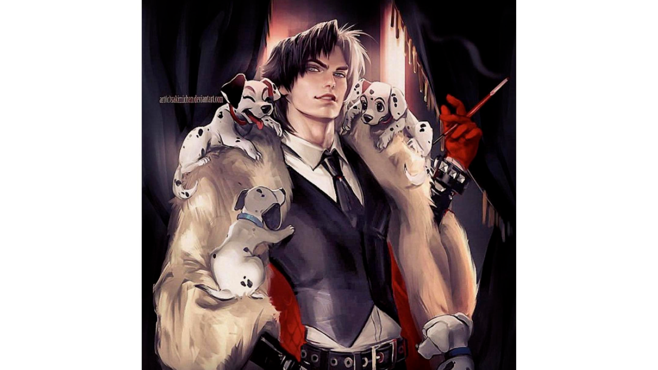 Imposible fallarle a la moda. Así luciría la versión masculina de Cruella portando su icónico abrigo y la boquilla roja para sostener su cigarrillo de forma elegante. Por supuesto que esta idea retoma la versión de Disney con sus dálmatas alrededor y el cabello bicolor que Emma Stone usó en el live-action de la villana.