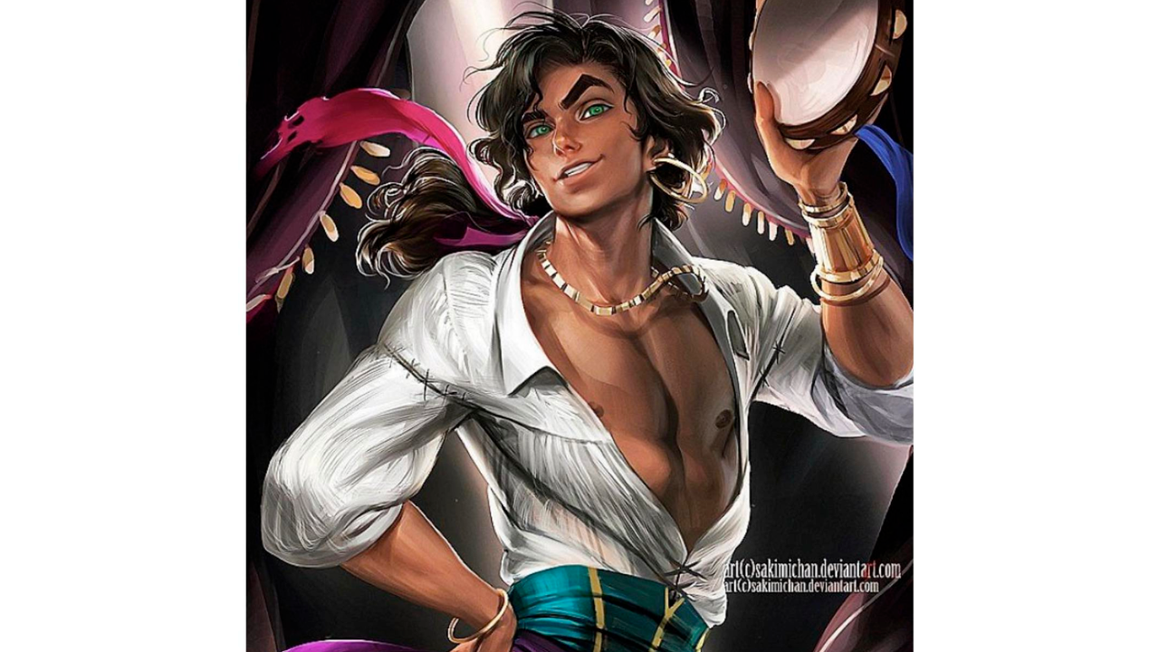Conocimos a Esmeralda en El jorobado de Notre Dame y se presentó con su característico estilo de gitana. En este caso su versión masculina conserva todo el outfit incluidas las alhajas en las muñecas, el cuello y arracadas adornando su rostro.