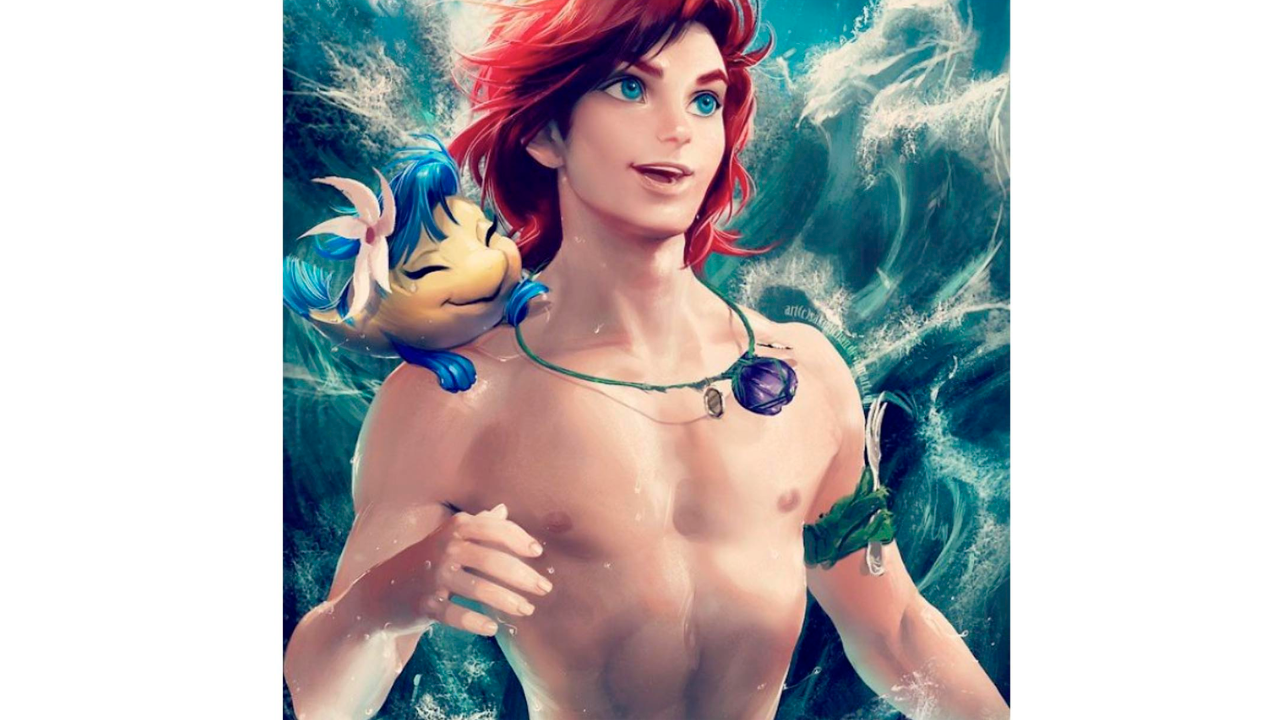 En su versión masculina Ariel sería un tritón ávido por salir del mar, conocer la vida fuera del agua y caminar junto a los humanos en la arena. El protagonista de esta reinversión de La Sirenita estaría perfectamente listo para sus aventuras con un cachibache atado al brazo y su inseparable amiga Flounder.