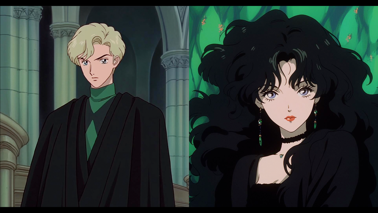 Draco parece salido directamente de Sailor Moon, e incluso, tiene el mismo porte que personajes como Darien, mejor conocido como Tuxedo Mask. Tal vez, si a Darien le hubiesen decolorado el cabello, esta imagen de Draco sería el resultado. En cuanto a Bellatrix, la bruja desquiciada luce como una villana de Sailor Moon, la mismísima reina Beryl.