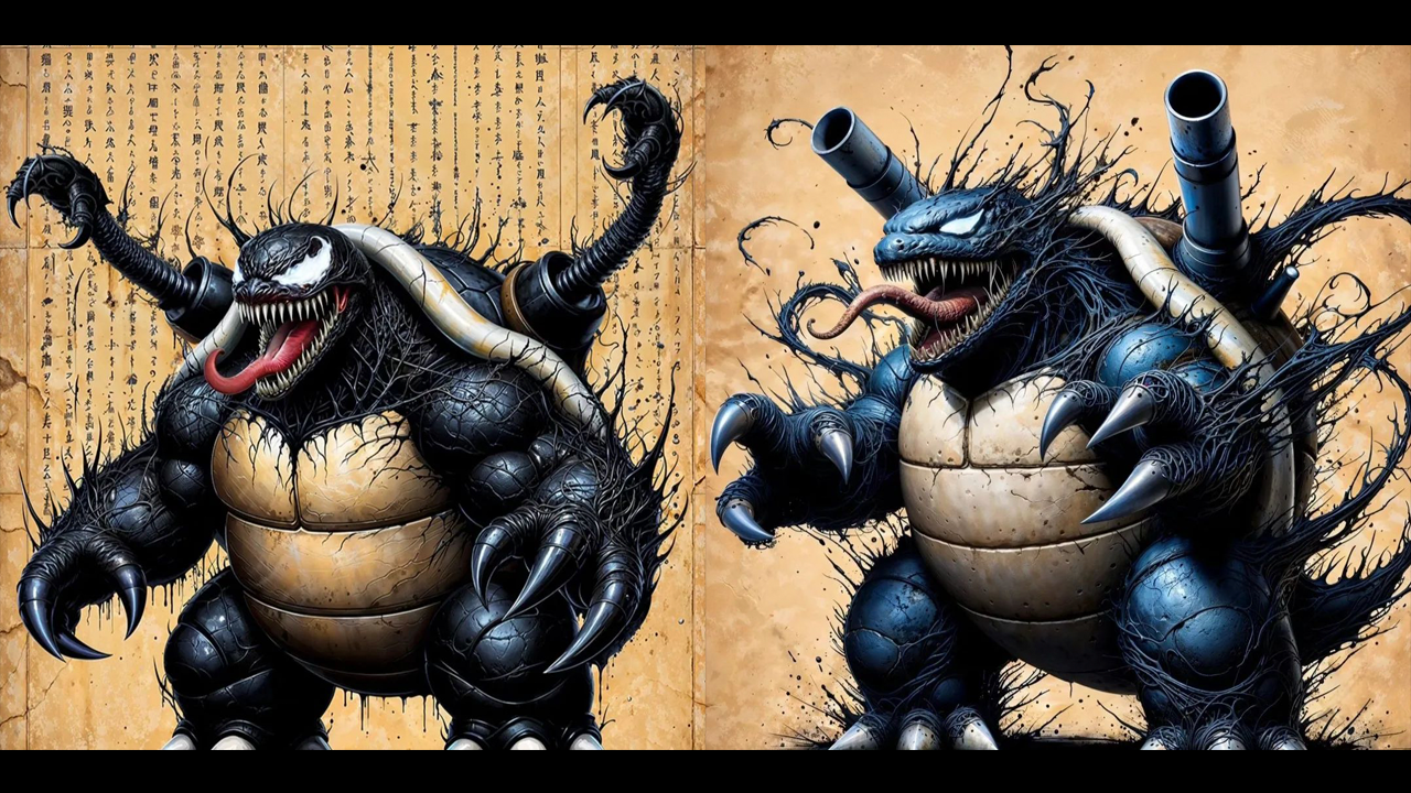 Blastoise también fue invadido por el maligno alienígena simbionte, aumentando considerablemente las habilidades del Pokémon. De los cañones de Blastoise ya no lanza el ataque de Hidro-Bomba, sino que ahora salen dos garras de Venom para dañar a sus oponentes. La imagen de Blastoise y Venom podría dar pesadillas.