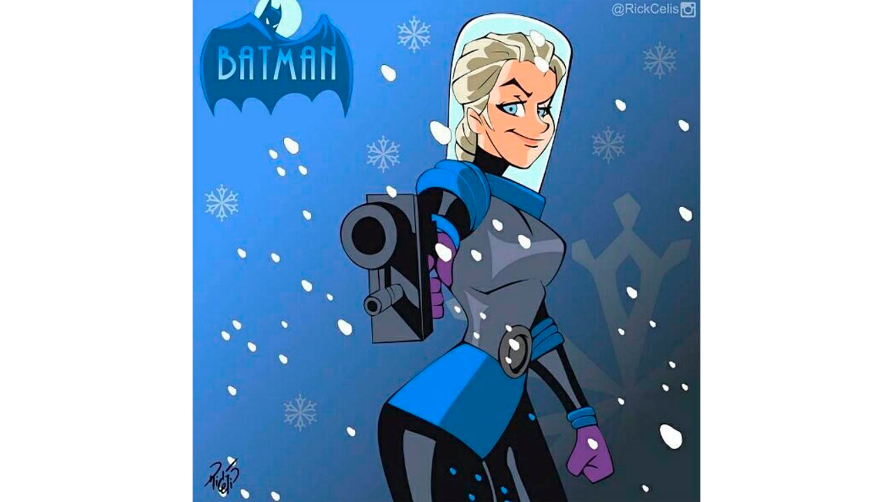 Finalmente, la reina Elsa de Frozen llegaría a Ciudad Gótica con sus poderes de hielo, por lo que lo más lógico es retratarla como el villano Sr. Frío. Con sus planes por congelarlo todo, conocimos a este personaje en el cine con Arnold Schwarzenegger en la película Batman y Robin aunque sin duda Elsa tendría una gran ventaja pues la capacidad para helar al mundo es innata en ella.