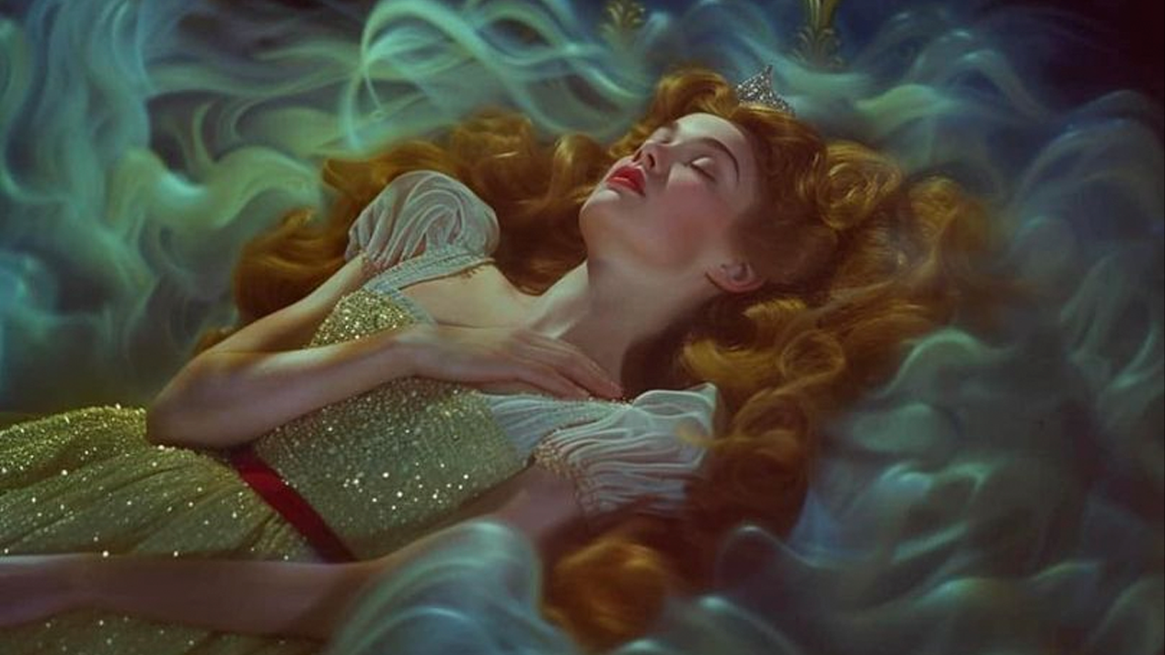 Tras tocar la rueca, Aurora cumple con su destino: mantenerse en un profundo sueño hasta que un beso de amor la despierte. La escena creada con inteligencia artificial es sumamente mágica y captura la esencia de La bella durmiente en una imagen.