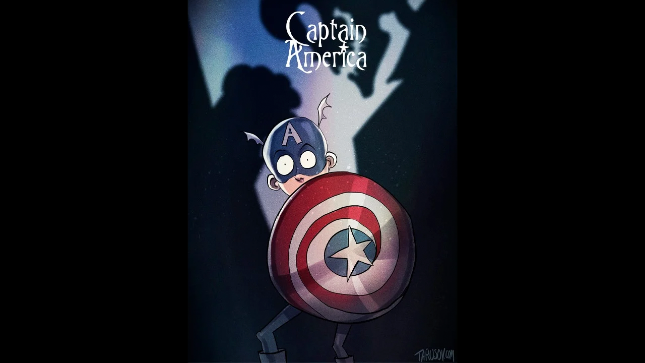 El Capitán América: El primer vengador de Tim Burton no parece ser tan valiente como Chris Evans. Con una mirada asustada, el héroe de traje azul, rojo y blanco mira fijamente a una sombra que lo aterra y que posiblemente vaya a atacarlo.