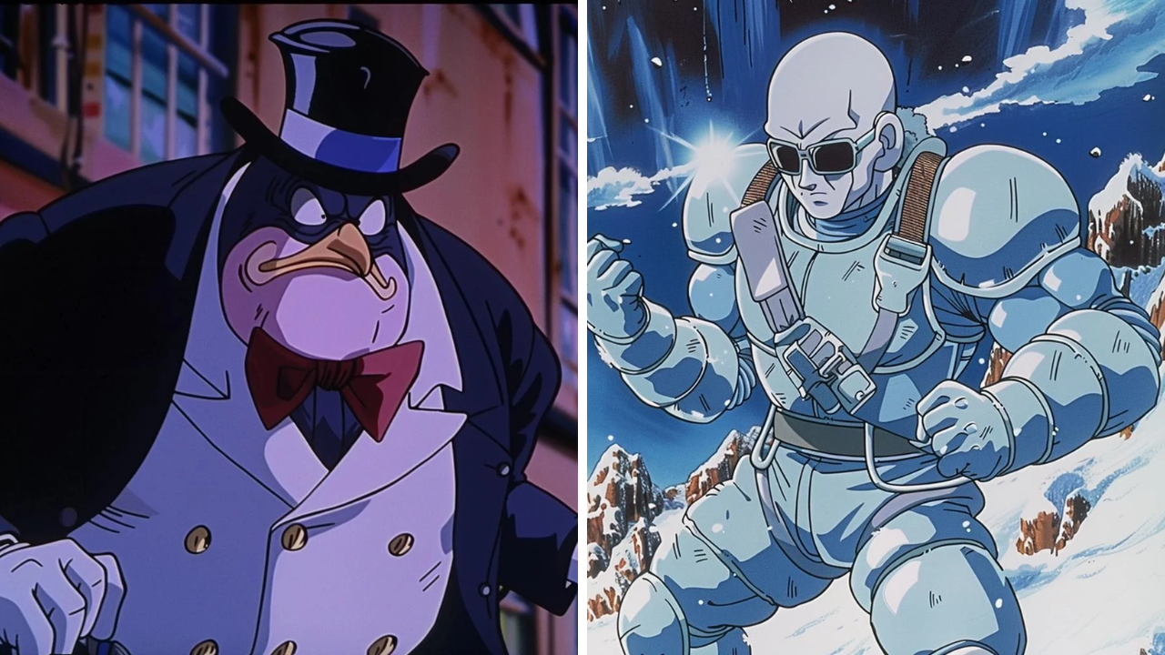 El Pingüino (Danny DeVito) tendría un diseño más caricaturesco y robusto, con su característico paraguas y un atuendo que resaltaría su apariencia grotesca y cómica. Sus movimientos y expresiones serían amplificadas para destacar su naturaleza astuta. Sr. Frío (Arnold Schwarzenegger), con su traje criogénico, sería una figura imponente, con detalles finos en su armadura que mostrarían el brillo y el frío emanando de su cuerpo. Sus ataques congelantes serían representados con efectos espectaculares, capturando la esencia de su poder helado.