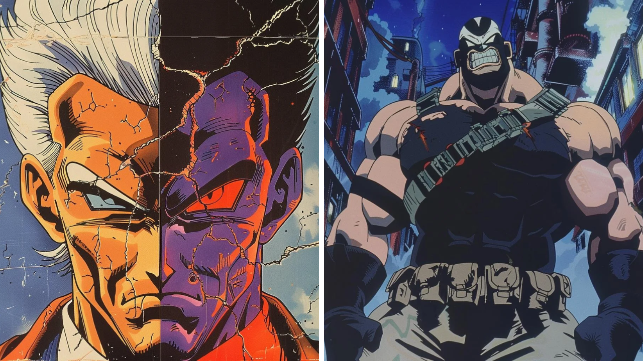 Dos Caras (Tommy Lee Jones y Aaron Eckhart) tendría una apariencia claramente dividida, con un lado de su rostro y traje impecable y el otro grotescamente deformado, reflejando su conflicto interno. Sus expresiones serían intensas y dramáticas, subrayando su lucha entre el bien y el mal. Mientras que Bane (Tom Hardy) sería un coloso imponente, con músculos exagerados y una máscara detalladamente diseñada.