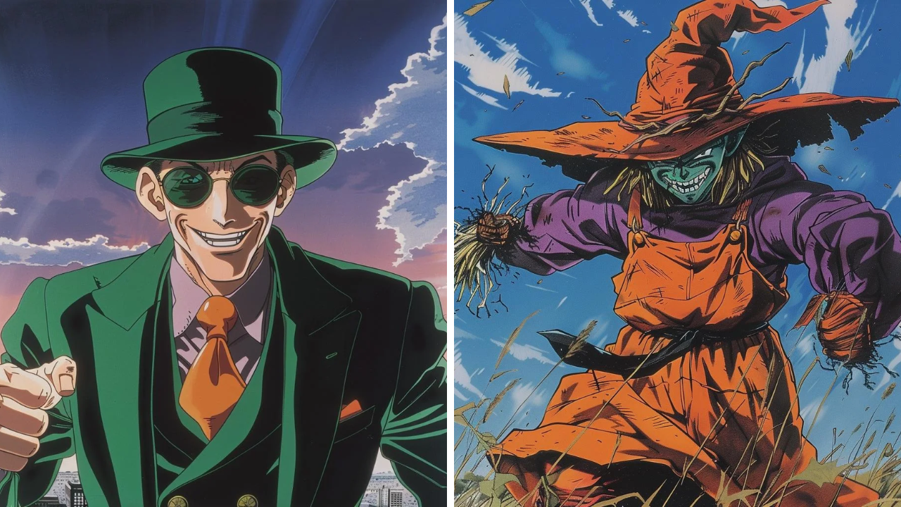 El Acertijo (que ha sido interpretado por Jim Carrey y Paul Dano) tendría un traje verde oscuro más discreto, sin los habituales símbolos de interrogación. Sus enigmas y trampas estarían llenos de detalles y colores opacos. Por su parte, el Espantapájaros (Cillian Murphy en cine), con su aspecto terrorífico, tendría un diseño más sombrío y espeluznante, con detalles finos en su máscara y traje que acentuarían su capacidad de inducir miedo.