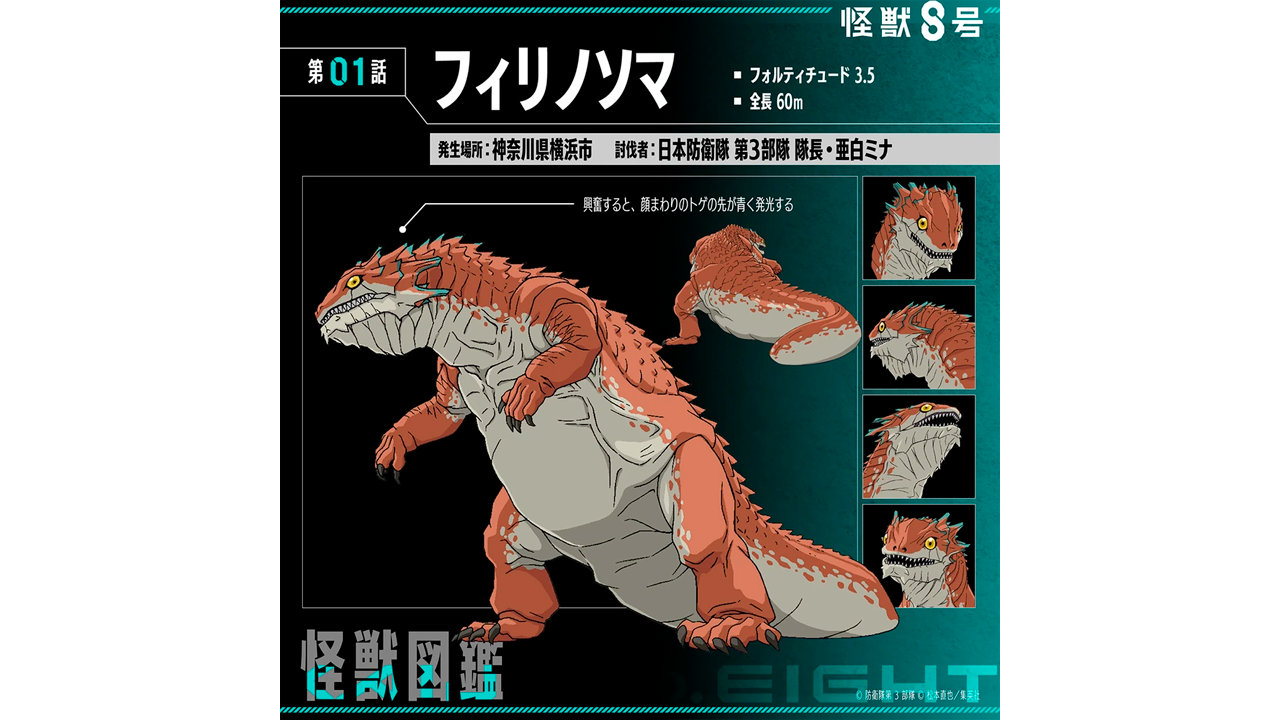 El siguiente kaiju en la lista es de los primeros en aparecer en la serie pues Philinosoma es eliminado por Mina Ashiro en el primer episodio. El nivel de fuerza de este monstruo de 60 metros de altura es de 3.5 y como detalle, las espinas alrededor de su cabeza se tornan de color azul contrastando con el resto de su cuerpo.