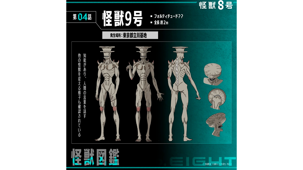 Finalmente también con una estatura aparente de dos metros, el Kaiju No. 9 que apareció por primera vez en el cuarto capítulo, es uno de los más peligrosos en la trama. Aunque su nivel de fuerza no ha sido medido de forma oficial por la Fuerza de Defensa, tiene la capacidad de hablar, razonar y controlar a otros kaiju pues fue él quien revivió a los monstruos del examen final. Además, al final del episodio ocho nos enteramos que tiene una habilidad única de "cambia pieles".
