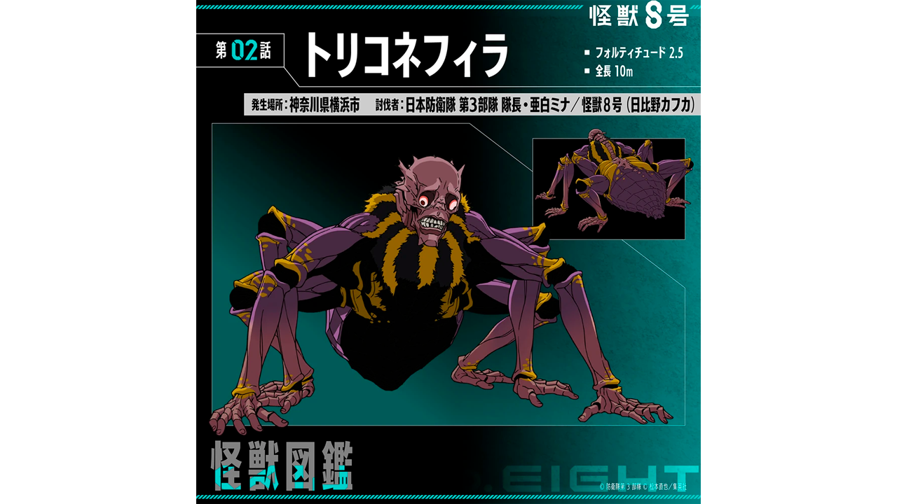 Midiendo 10 metros de altura Trichonephila es el kaiju que persigue a Ichikawa y Kafka en el episodio dos. El nivel de fuerza de esta bestia con la apariencia de una araña radioactiva es también de 2.5.
