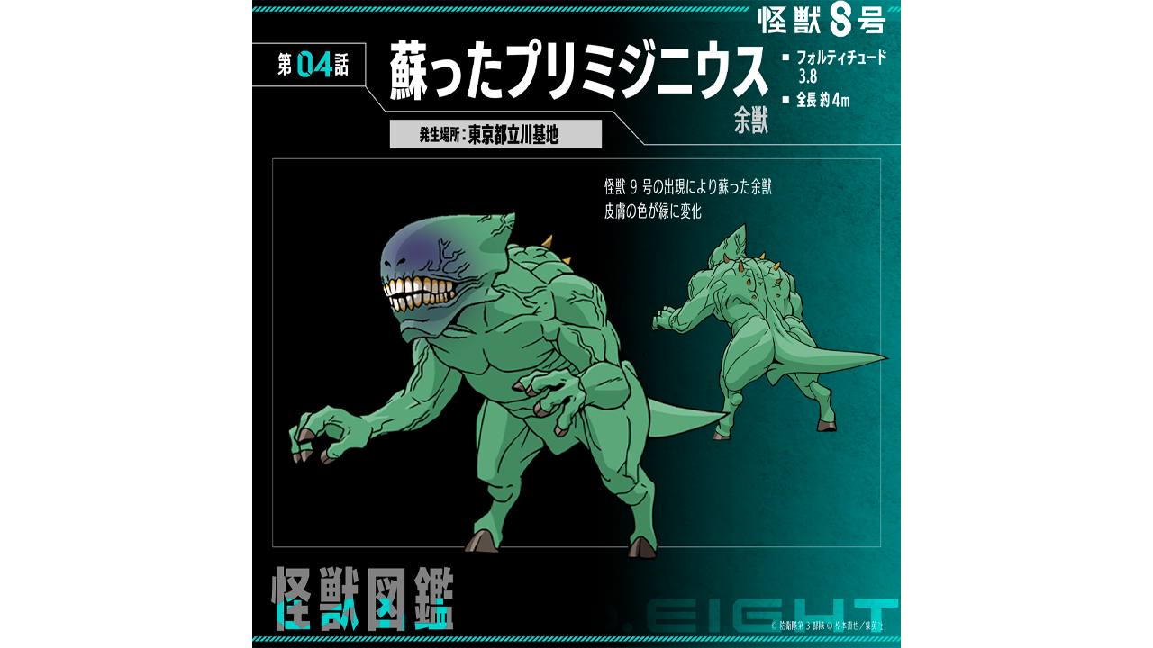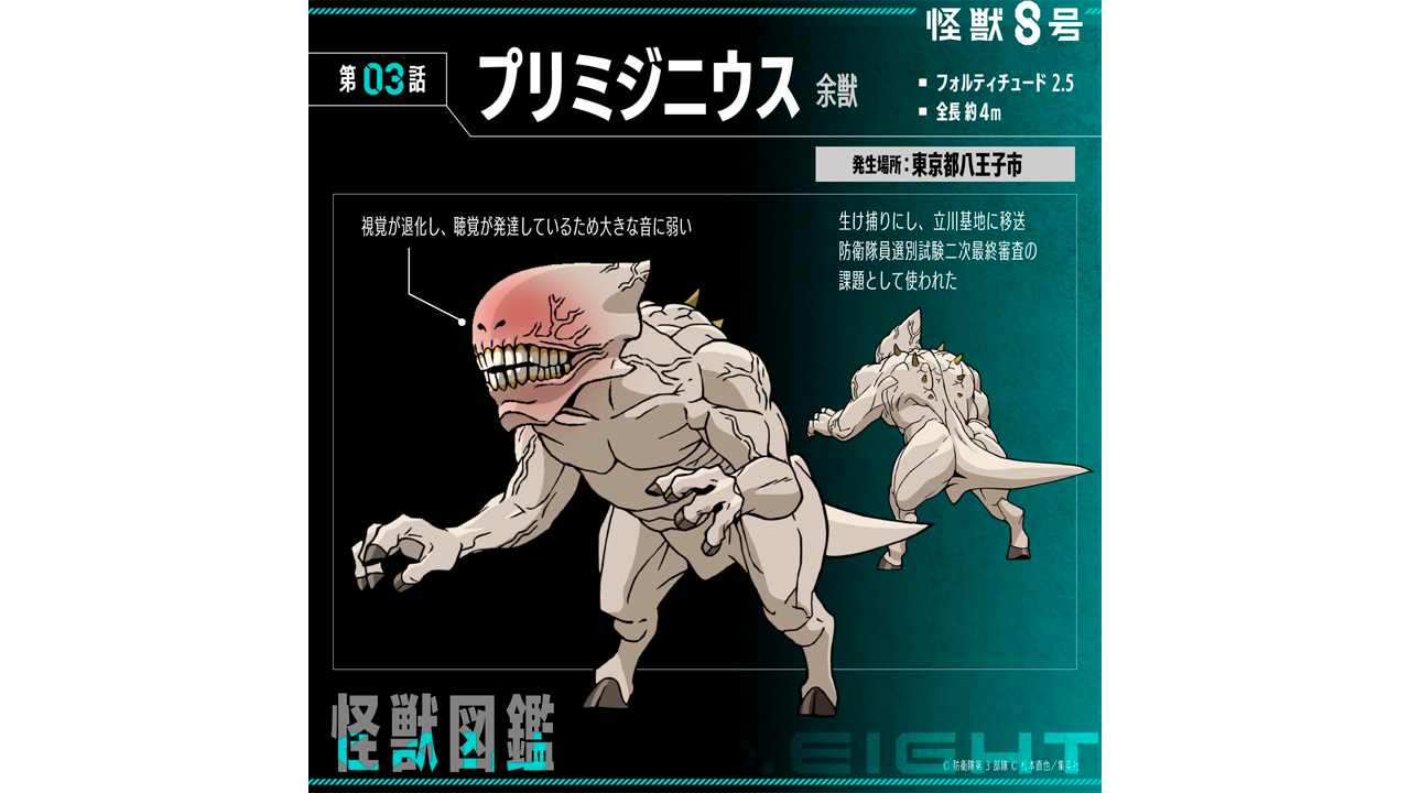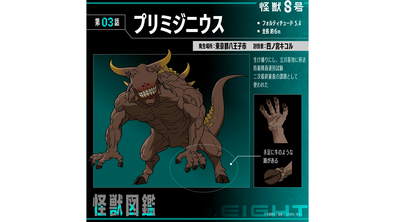 Otro de los kaijus que los aspirantes a las Fuerzas de Defensa debían eliminar en el tercer episodio del anime era un Primigenius de otro tipo. Esta especie de seis metros que lleva un par de cuernos filosos en su cabeza posee una fuerza de 5.4 por lo que roza al nivel de Honju.