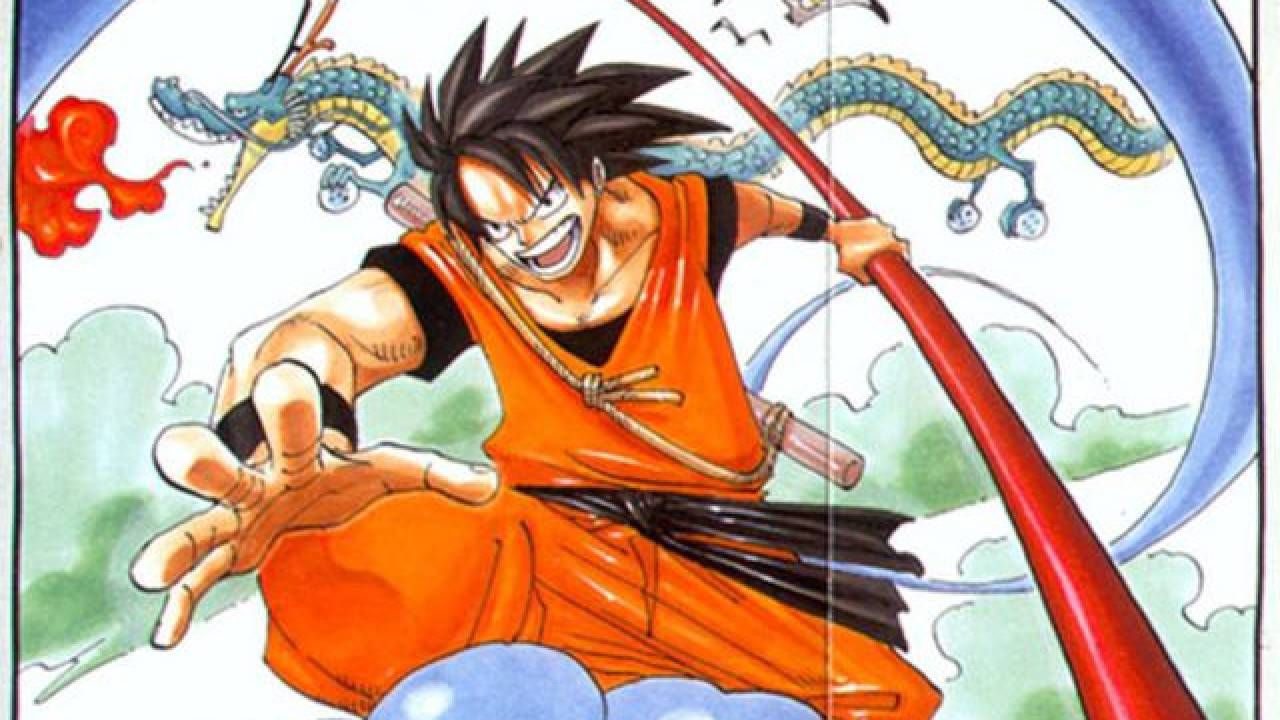 Si Luffy necesitara apoyo de un guerrero saiyajin en One Piece, así se vería Goku llegando en su nube voladora y cargado el báculo sagrado, si fuera dibujado por Eiichiro Oda.
