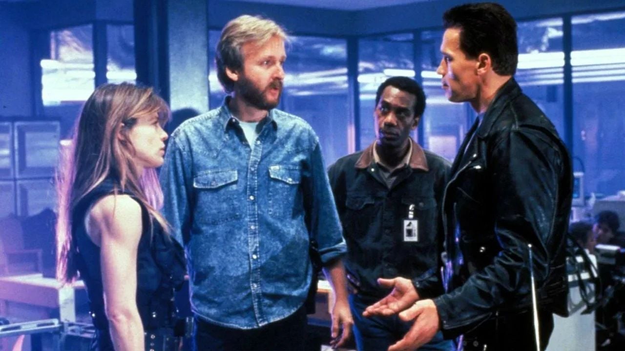 Esta imagen detrás de cámaras de Terminator 2: El juicio final muestra a los pilares de la franquicia en un solo lugar: James Cameron, Arnold Schwarzenegger y Linda Hamilton.