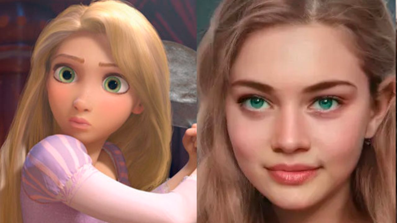 Con al voz de Danna Paola conocemos solamente la versión animada de Rapunzel en Enredados. Para un live-action, esta es la propuesta de la IA, los grandes ojos verdes (y el pelo largo y mágico) son el detalle que nos hace recordar a la princesa.