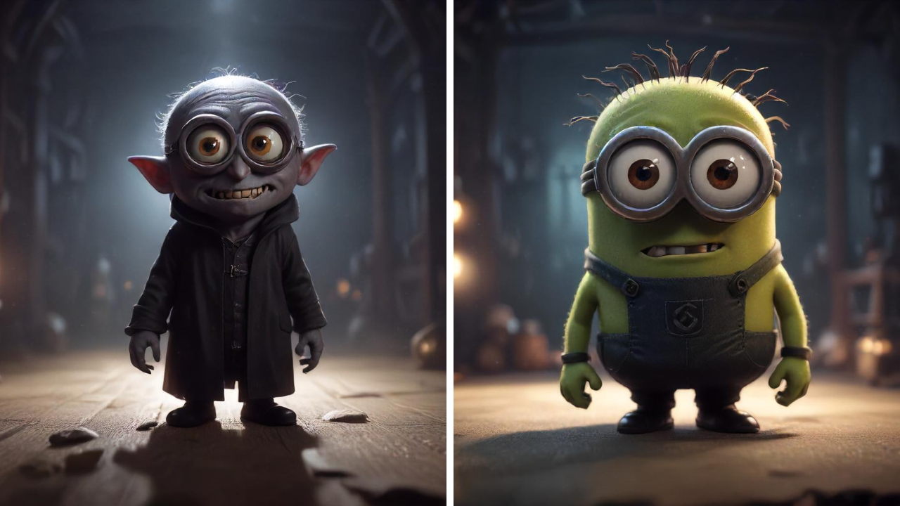 El clásico Nosferatu, transformado en Minion, mantendría su figura delgada, orejas puntiagudas y largos dedos, pero con un aire de inocencia que desarma su habitual terror. Este Nosferatu-Minon deambula buscando tal vez una banana en lugar de sangre. Junto a él, Frankenstein se convierte en un Minion robusto con tornillos en el cuello y cicatrices en la cara. Con su andar torpe y sus característicos gruñidos, este Frankenstein-Minon sería más propenso a causar risas que miedo.