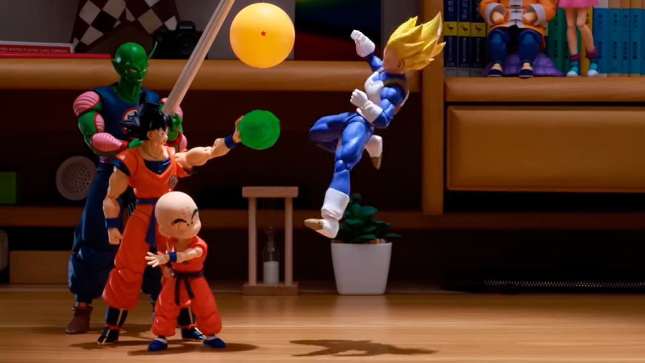 Finalmente en un video dedicado completamente a Dragon Ball y sus personajes vemos a todos los guerreros como Krilin, Goku, Piccolo y demás realizando algunos movimientos marciales impresionantes; también a Bulma recuperando una esfera del dragón y acabando con el mismo Darth Vader de Star Wars. Pero en este frame específico vemos a Vegeta pateando tres esferas en diferentes alturas aunque parece que con la primera Krilin se llevó un buen golpe en la mano.