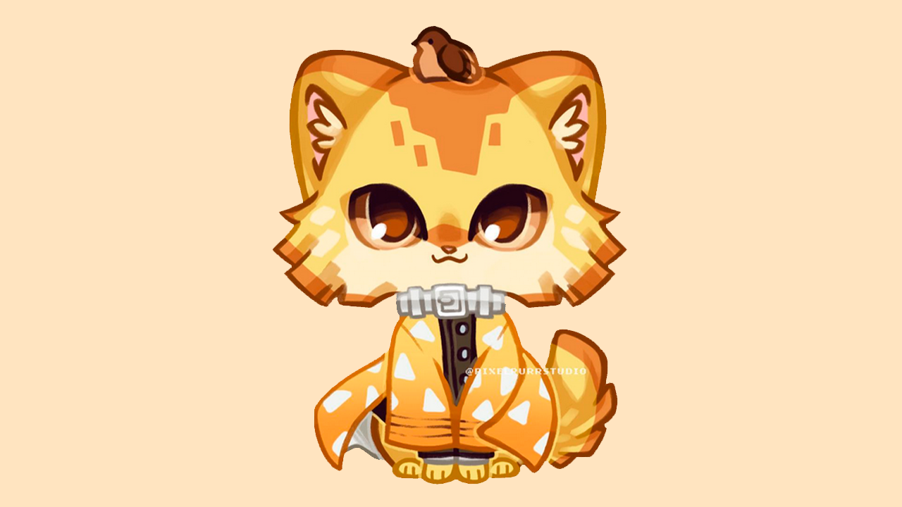 Desde las primeras temporadas, Zenitsu fue uno de los personajes más divertidos de la serie. Aunque tras lo ocurrido en la última temporada lo vimos cambiar su sonriente y tembloroso semblante por un rostro serio y determinado, su versión felina lleva lo más tierno del personaje. Luciendo su haori del mismo tono, se convertiría en un gatito naranja acompañado siempre de su fiel gorrión Chuntaro.