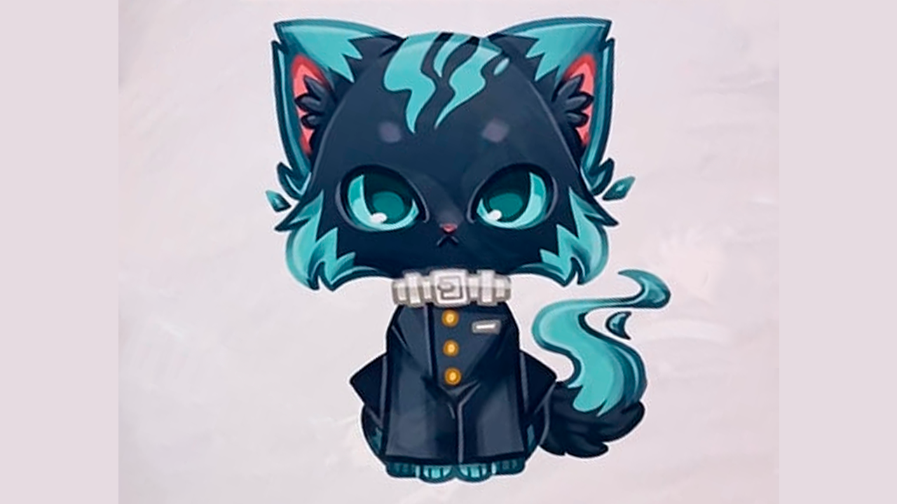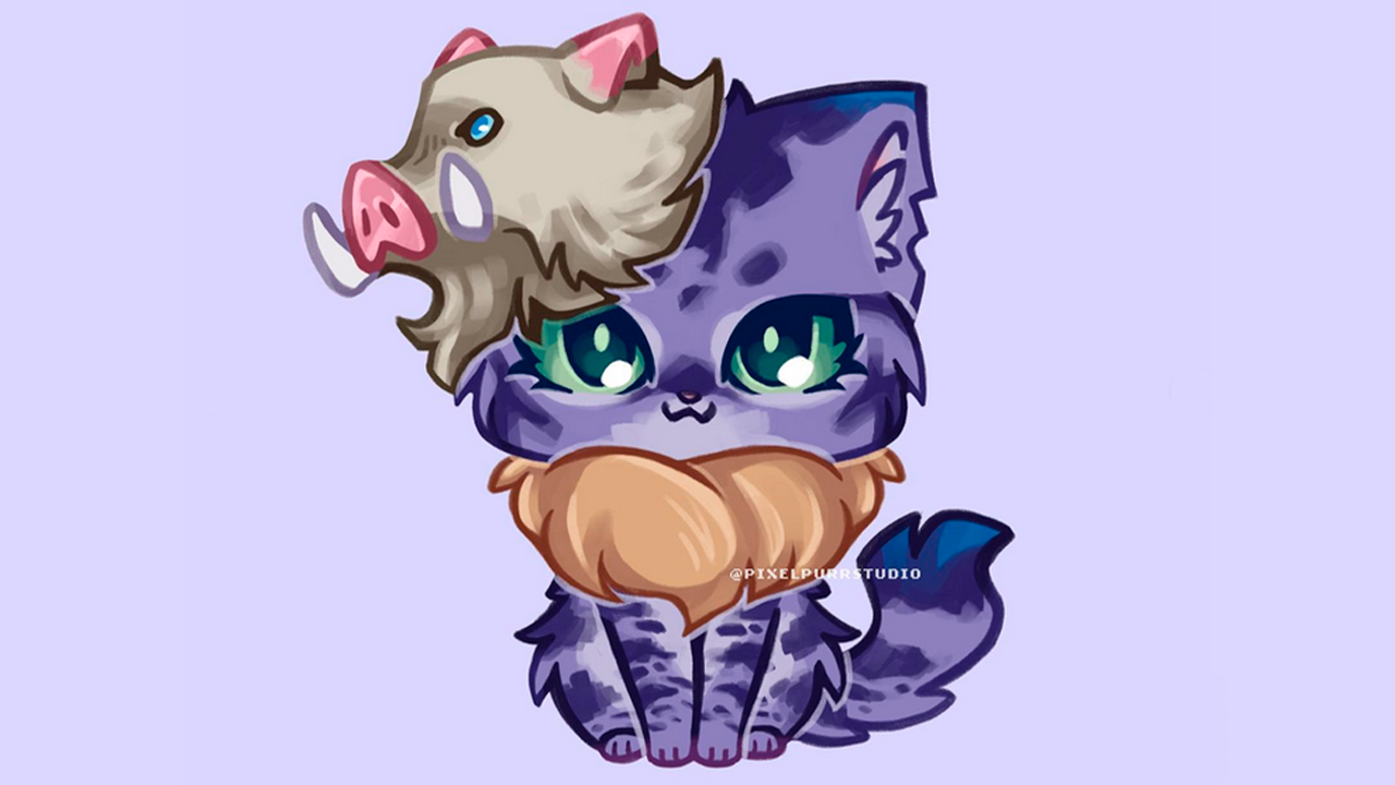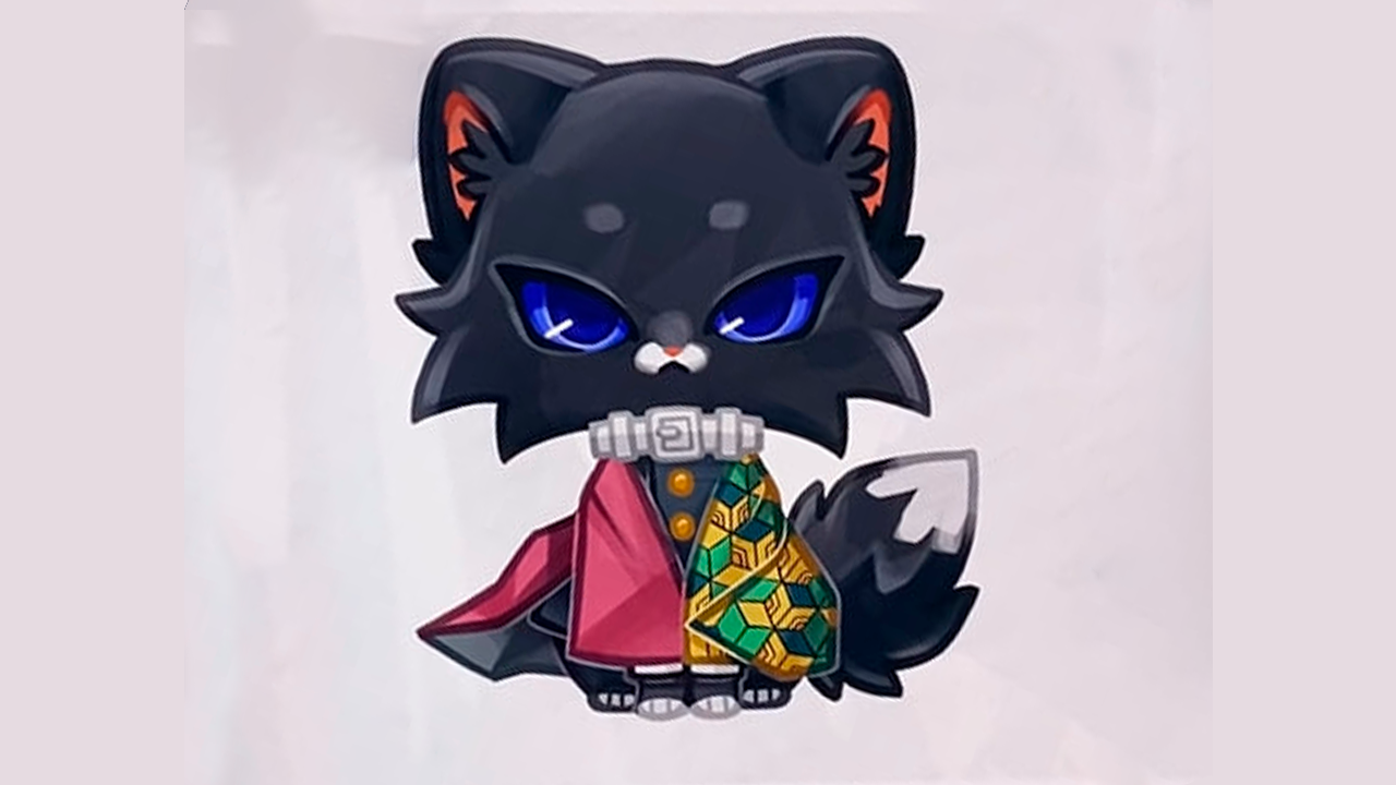 Imposible dejar atrás al poderoso Inosuke. Su adorable versión felina sería un gatito moteado que llevaría consigo la máscara de jabalí recargada en la esquina superior de su cabeza para lucir ese par de ojos verdes y brillantes que también caracterizan al personaje. El pelaje que normalmente lleva su versión humana alrededor de la cintura ahora pasaría a ser una especie de bufanda alrededor de su cuello.